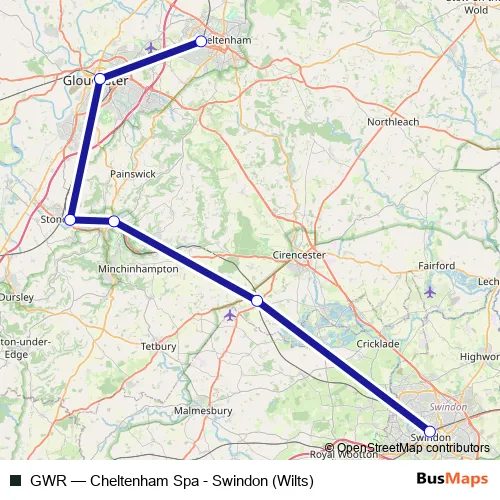 The first stop of the GWR rail route is Swindon (Wilts) and the last stop is Cheltenham Spa. GWR (Cheltenham Spa - Swindon (Wilts)) is operational during everyday.