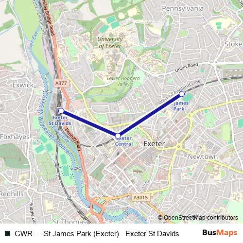 The first stop of the GWR rail route is Exeter St Davids and the last stop is St James Park (Exeter). GWR (St James Park (Exeter) - Exeter St Davids) is operational during everyday.