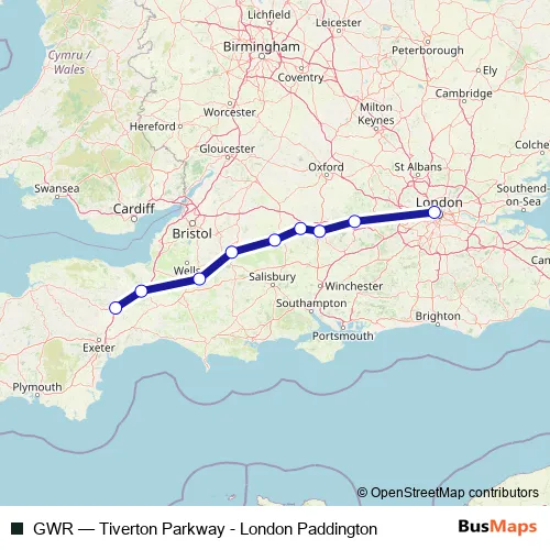 The first stop of the GWR rail route is Tiverton Parkway and the last stop is London Paddington. GWR (Tiverton Parkway - London Paddington) is operational during everyday.