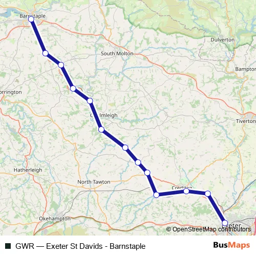 The first stop of the GWR rail route is Barnstaple and the last stop is Exeter St Davids. GWR (Exeter St Davids - Barnstaple) is operational during everyday.