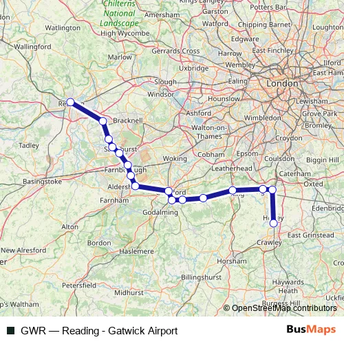 The first stop of the GWR rail route is Gatwick Airport and the last stop is Reading. GWR (Reading - Gatwick Airport) is operational during everyday.