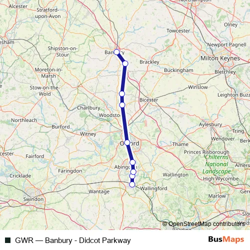 The first stop of the GWR rail route is Didcot Parkway and the last stop is Banbury. GWR (Banbury - Didcot Parkway) is operational during everyday.