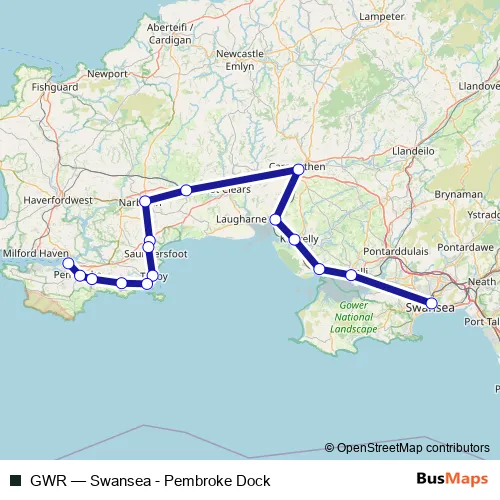 The first stop of the GWR rail route is Swansea and the last stop is Pembroke Dock. GWR (Swansea - Pembroke Dock) is operational during everyday.