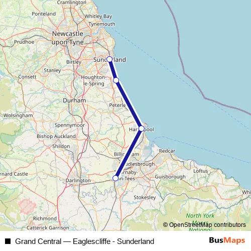 The first stop of the Grand Central bus route is Sunderland and the last stop is Eaglescliffe. Grand Central (Eaglescliffe - Sunderland) is operational during on weekends.