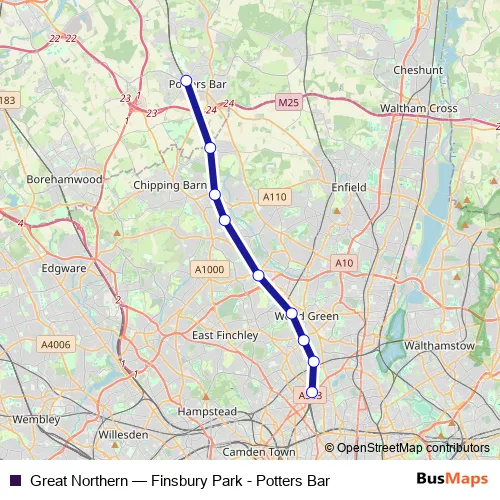 The first stop of the Great Northern rail route is Finsbury Park and the last stop is Potters Bar. Great Northern (Finsbury Park - Potters Bar) is operational during everyday.