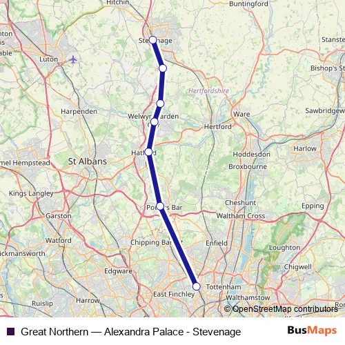 The first stop of the Great Northern rail route is Alexandra Palace and the last stop is Stevenage. Great Northern (Alexandra Palace - Stevenage) is operational during everyday.