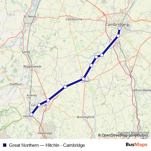 The first stop of the Great Northern rail route is Cambridge and the last stop is Hitchin. Great Northern (Hitchin - Cambridge) is operational during everyday.