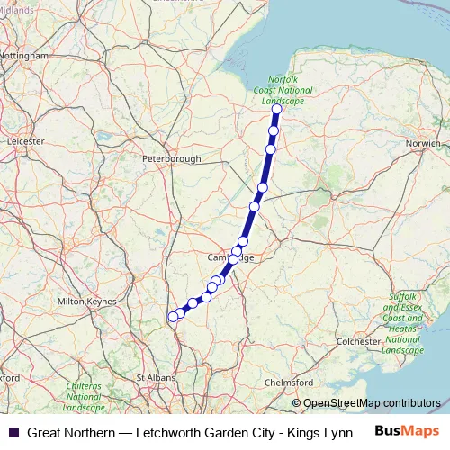 The first stop of the Great Northern rail route is Kings Lynn and the last stop is Letchworth Garden City. Great Northern (Letchworth Garden City - Kings Lynn) is operational during everyday.