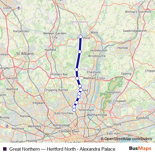 Click here to view the nearest Great Northern - Hertford North - Alexandra Palace bus stop.
