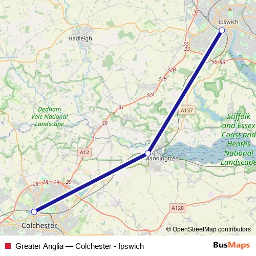 The first stop of the Greater Anglia rail route is Colchester and the last stop is Ipswich. Greater Anglia (Colchester - Ipswich) is operational during everyday.