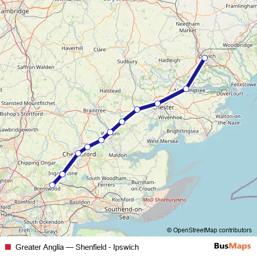 The first stop of the Greater Anglia rail route is Shenfield and the last stop is Ipswich. Greater Anglia (Shenfield - Ipswich) is operational during on weekends.