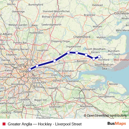 The first stop of the Greater Anglia rail route is Liverpool Street and the last stop is Hockley. Greater Anglia (Hockley - Liverpool Street) is operational during everyday.