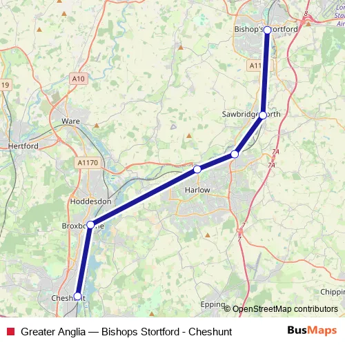 The first stop of the Greater Anglia bus route is Bishops Stortford and the last stop is Cheshunt. Greater Anglia (Bishops Stortford - Cheshunt) is operational during everyday.