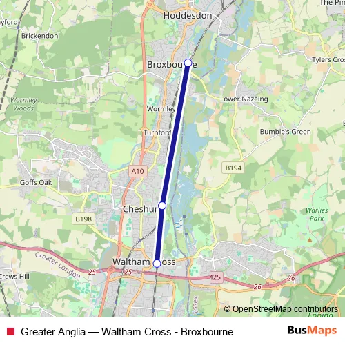 Click here to view the nearest Greater Anglia - Waltham Cross - Broxbourne bus stop.