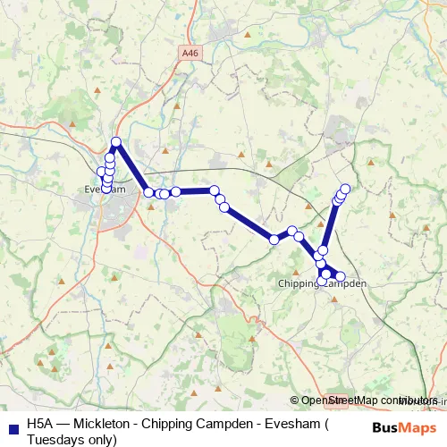 Click here to view the nearest H5A - Mickleton - Chipping Campden - Evesham (Tuesdays only) bus stop.