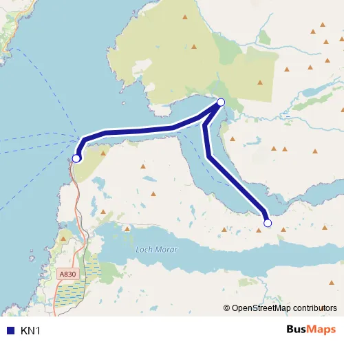 The first stop of the KN1 ferry route is Mallaig (for Knoydart) Ferry Terminal and the last stop is Mallaig (for Knoydart) Ferry Terminal. KN1 is operational during everyday.