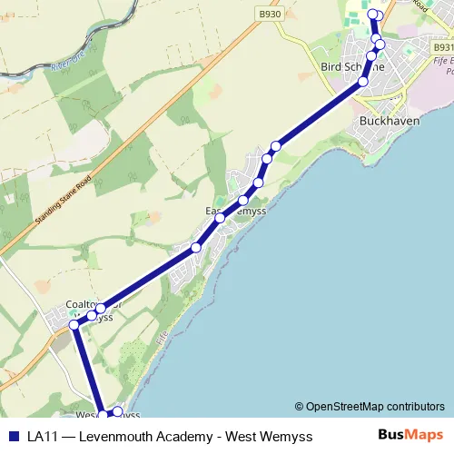 The first stop of the LA11 bus route is Levenmouth Academy and the last stop is Post Office. LA11 (Levenmouth Academy - West Wemyss) is operational during on weekdays.