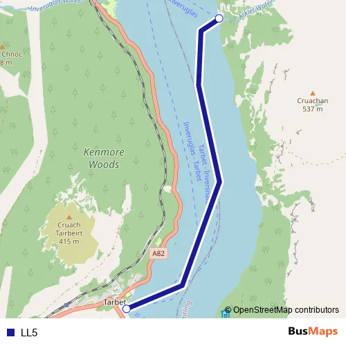 The first stop of the LL5 ferry route is Tarbet (Loch Lomond) Pier and the last stop is Inversnaid Pier. LL5 is operational during everyday.