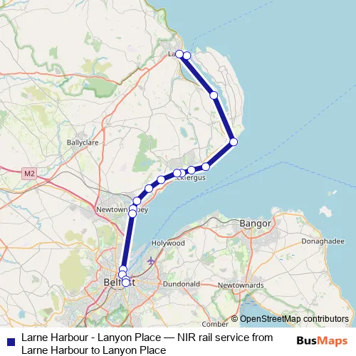 The first stop of the Larne Harbour - Lanyon Place rail route is Larne Harbour and the last stop is Lanyon Place. Larne Harbour - Lanyon Place (NIR rail service from Larne Harbour to Lanyon Place) is operational during everyday.