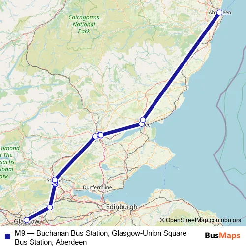 Services on the M9 - Buchanan Bus Station, Glasgow-Union Square Bus Station, Aberdeen bus start at 00:40 on Monday, Tuesday, Wednesday, Thursday, Friday, Saturday, Sunday.