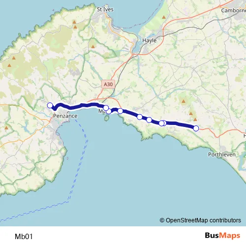 The first stop of the Mb01 bus route is Ashton, Lion & Lamb and the last stop is Heamoor, Mounts Bay Academy. Mb01 is operational during on weekdays.