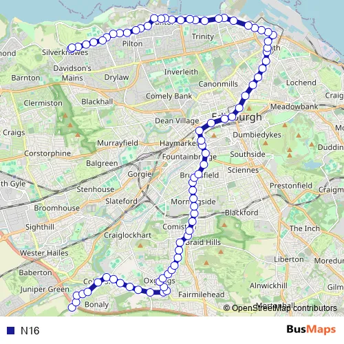 See why over 2 million users trust and consider busmaps.com as the best public transport website. busmaps gives you Edinburgh Buses suggested routes, real-time bus tracker, line route maps in Edinburgh, and helps to find the closest N16 bus stops near you. No internet available? Download an offline PDF map and bus schedule for the N16 bus to take on your trip.