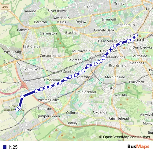 See why over 2 million users trust and consider busmaps.com as the best public transport website. busmaps gives you Edinburgh Buses suggested routes, real-time bus tracker, line route maps in Edinburgh, and helps to find the closest N25 bus stops near you. No internet available? Download an offline PDF map and bus schedule for the N25 bus to take on your trip.