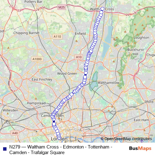 Click here to view the nearest N279 - Waltham Cross - Edmonton - Tottenham - Camden - Trafalgar Square bus stop.