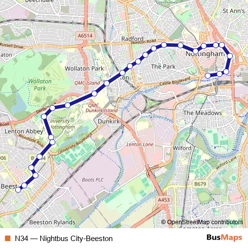 The first stop of the N34 bus route is Canal Street and the last stop is Beeston Bus & Tram Interchange. N34 (Nightbus City-Beeston) is operational during everyday.