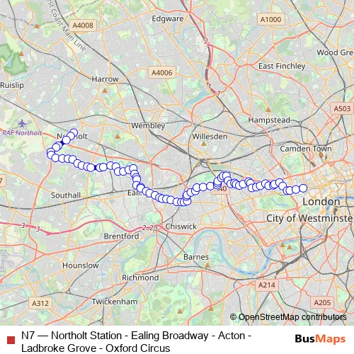 Bus N7 - Northolt Station - Ealing Broadway - Acton - Ladbroke Grove - Oxford Circus: Full Schedule in London