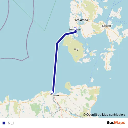 The first stop of the NL1 ferry route is Scrabster Ferry Terminal and the last stop is Stromness Orkney Ferry Terminal. NL1 is operational during everyday.