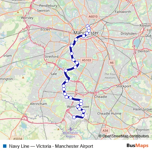 The first stop of the Navy Line tram route is Victoria (Manchester Metrolink) and the last stop is Manchester Airport (Manchester Metrolink). Navy Line (Victoria - Manchester Airport) is operational during everyday.