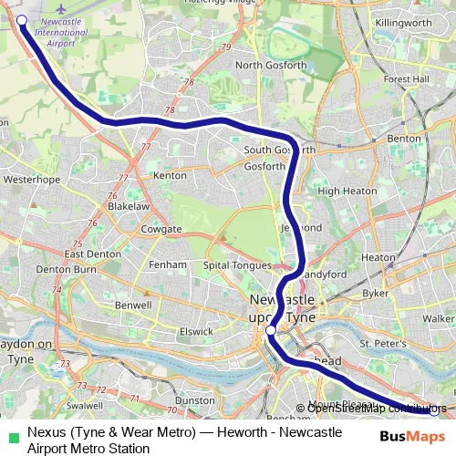 The first stop of the Nexus (Tyne & Wear Metro) metro route is Heworth and the last stop is Newcastle Airport Metro Station. Nexus (Tyne & Wear Metro) (Heworth - Newcastle Airport Metro Station) is operational during everyday.