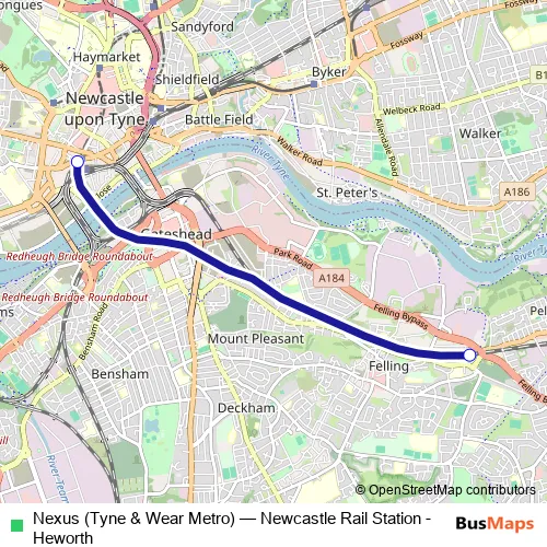 The first stop of the Nexus (Tyne & Wear Metro) metro route is Newcastle Rail Station and the last stop is Heworth. Nexus (Tyne & Wear Metro) (Newcastle Rail Station - Heworth) is operational during everyday.