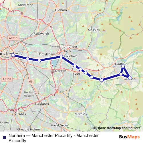 The first stop of the Northern rail route is Hadfield and the last stop is Manchester Piccadilly. Northern (Manchester Piccadilly - Manchester Piccadilly) is operational during everyday.
