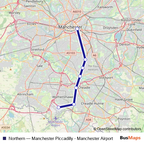 The first stop of the Northern rail route is Manchester Piccadilly and the last stop is Manchester Airport. Northern (Manchester Piccadilly - Manchester Airport) is operational during everyday.