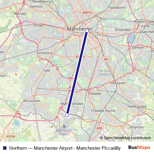 The first stop of the Northern rail route is Manchester Airport and the last stop is Manchester Piccadilly. Northern (Manchester Airport - Manchester Piccadilly) is operational during everyday.
