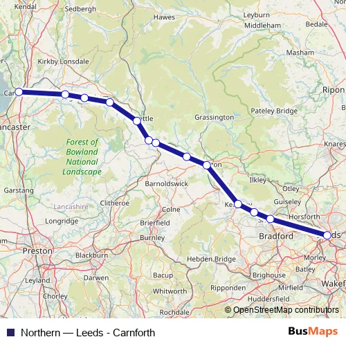 The first stop of the Northern rail route is Carnforth and the last stop is Leeds. Northern (Leeds - Carnforth) is operational during everyday.