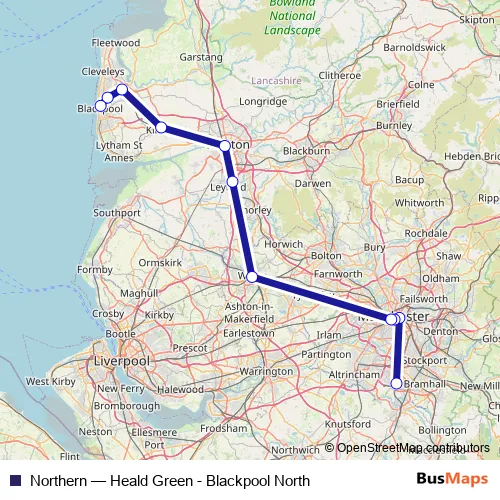 The first stop of the Northern rail route is Heald Green and the last stop is Blackpool North. Northern (Heald Green - Blackpool North) is operational during everyday.