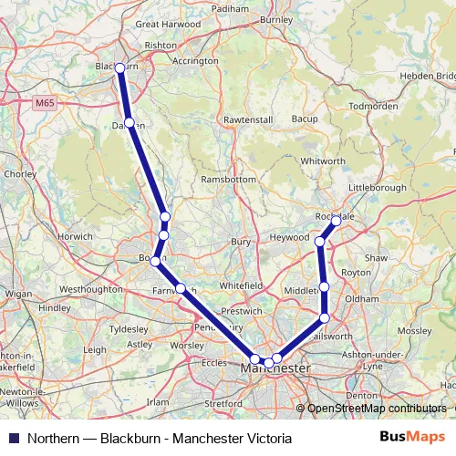 The first stop of the Northern rail route is Rochdale and the last stop is Blackburn. Northern (Blackburn - Manchester Victoria) is operational during everyday.