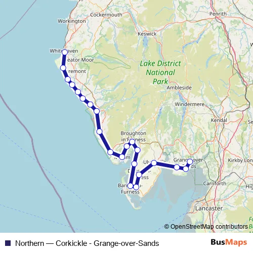 The first stop of the Northern rail route is Corkickle and the last stop is Grange-over-Sands. Northern (Corkickle - Grange-over-Sands) is operational during on weekends.