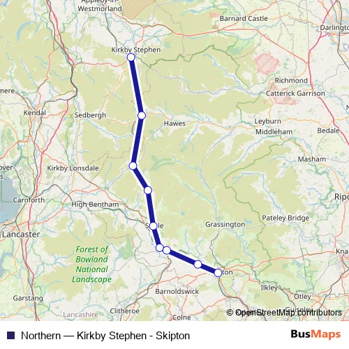 The first stop of the Northern bus route is Kirkby Stephen and the last stop is