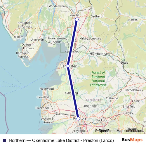 The first stop of the Northern bus route is Oxenholme Lake District and the last stop is Preston (Lancs). Northern (Oxenholme Lake District - Preston (Lancs)) is operational during everyday.
