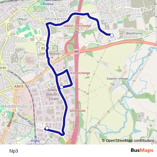 The first stop of the Np3 bus route is Anning Drive Park & Ride and the last stop is Sowton Park & Ride. Np3 is operational during on weekdays.