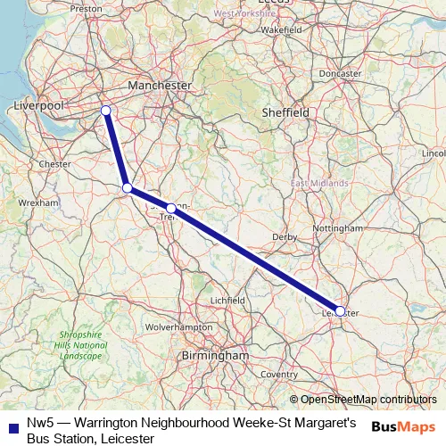 The first stop of the Nw5 bus route is St Margaret's Bus Station,Stand Sy and the last stop is Warrington (Victoria Park) Neighbourhood Weeken. Nw5 (Warrington Neighbourhood Weeke-St Margaret's Bus Station, Leicester) is operational during on weekends.