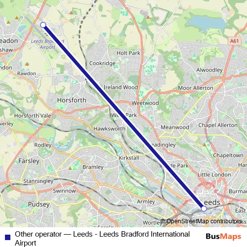 Leeds Bradford International Airport. Other operator (Leeds - Leeds Bradford International Airport) is operational during on weekdays.