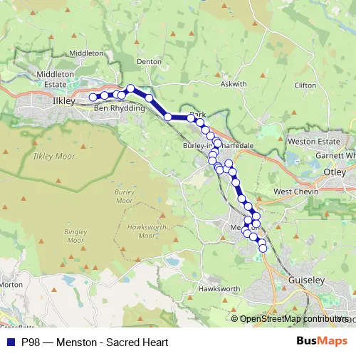 The first stop of the P98 bus route is Sacred Heart School and the last stop is St Mary's School. P98 (Menston - Sacred Heart) is operational during on weekdays.