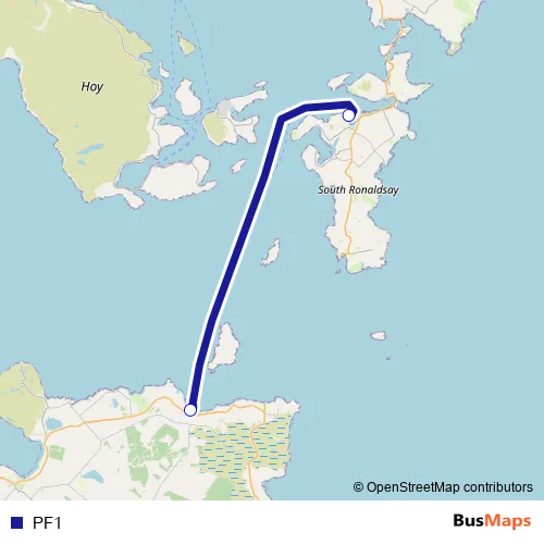 The first stop of the PF1 ferry route is St Margarets Hope Ferry Terminal and the last stop is Gills Bay Ferry Terminal. PF1 is operational during everyday.