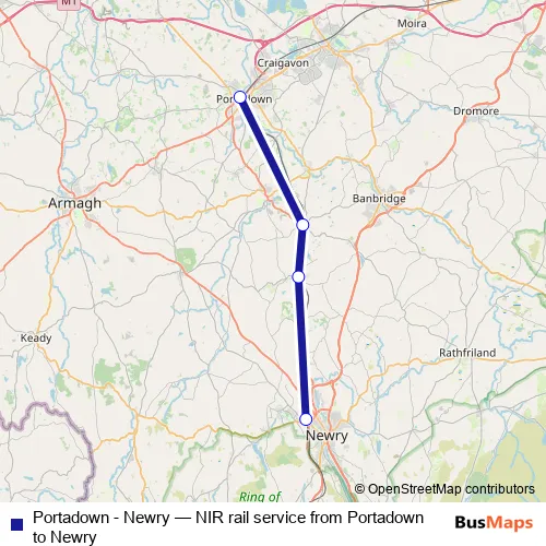 See why over 2 million users trust and consider busmaps.com as the best public transport website. busmaps gives you Portadown Rail Services suggested routes, real-time bus tracker, line route maps in Portadown, and helps to find the closest Portadown - Newry rail stops near you. No internet available? Download an offline PDF map and bus schedule for the Portadown - Newry rail to take on your trip.