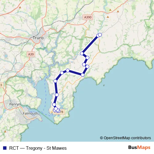 The first stop of the RCT bus route is Car Park and the last stop is Tregony Square. RCT (Tregony - St Mawes) is operational during everyday.